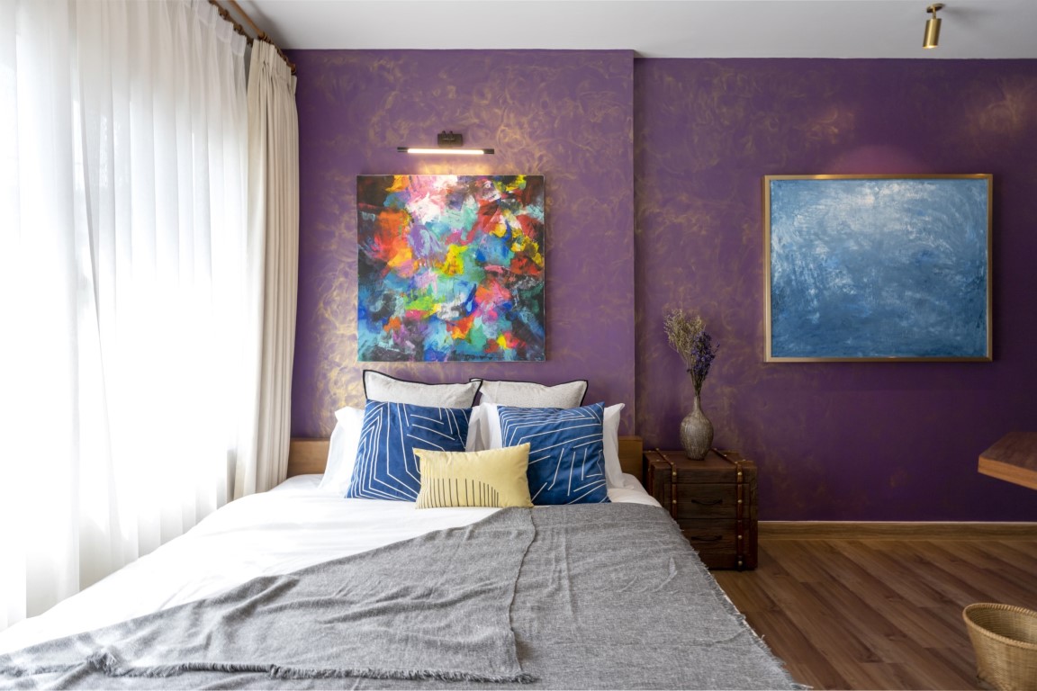 เป็นเตียงเดี่ยว ตกแต่งด้วยโทนสีสว่าง พร้อมผลงานศิลปะ ให้ความรู้สึกที่ผ่อนคลาย สบายตา