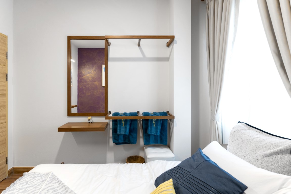 เป็นเตียงเดี่ยว แสงสวยมากในตอนเช้า มีข้าวของให้ใช้ได้อย่างครบครัน ห้องนี้มีระเบียง สามารถนั่งปาร์ตี้ นั่งคุยชิลๆ ได้
